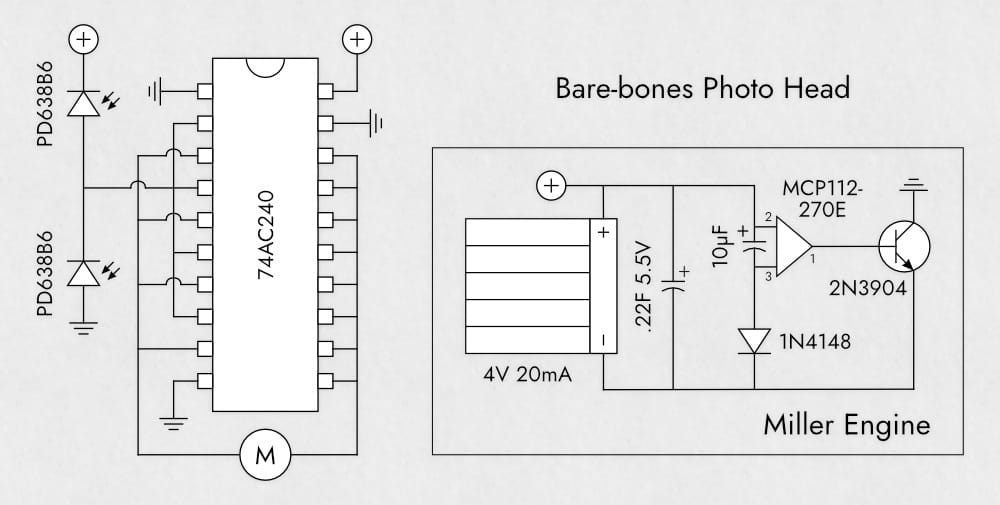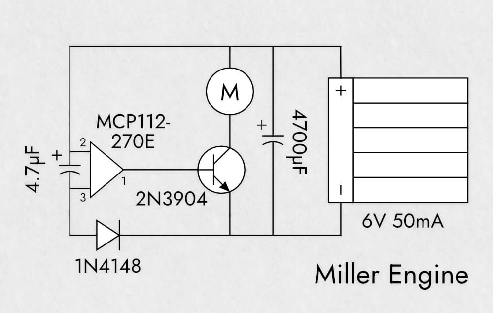 A simple desktop spinner using the Miller engine. It uses a 2.2µF timing capacitor and an MCP112-270E that triggers the circuit at 2.63V, powered by two solar panels in series providing 6V.