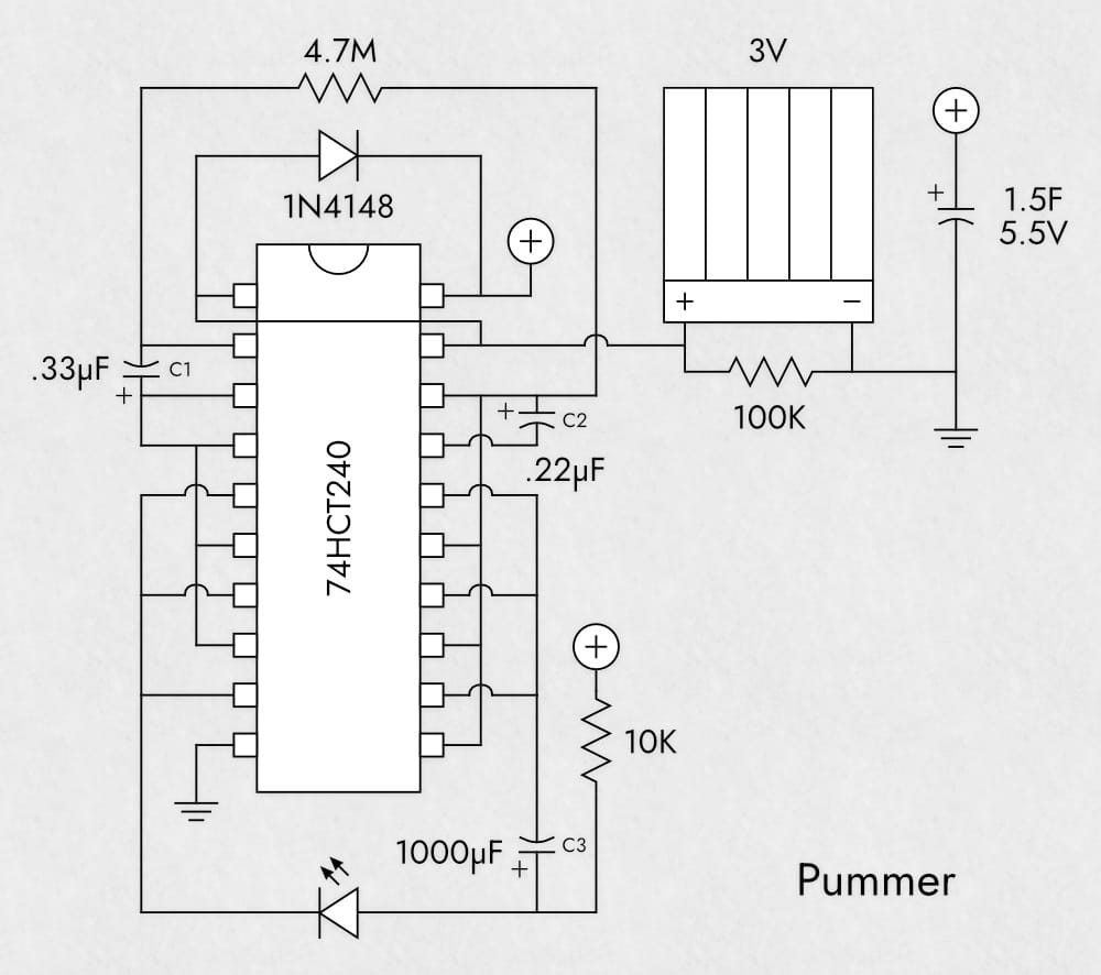 I built another photopopper, this time using the FRED solar engine: an improved, more efficient version of the simpler FLED design. Like my first one, it uses a 4700µF storage capacitor and a 5V solar panel.